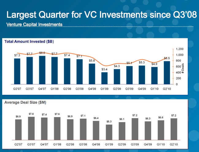 Venture capitalists invested $6.5 billion in 906 deals in the second quarter of 2010, according to a MoneyTree Report from PricewaterhouseCoopers LLP and the National Venture Capital Association, based on data provided by Thomson Reuters. Quarterly investment activity increased 34 percent in terms of dollars and 22 percent in number of deals compared to the first quarter of 2010 when $4.9 billion was invested in 740 deals.