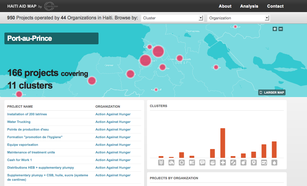 Because HaitiAidMap.org aggregates NGOs’ data, relief workers and philanthropists can use it to identify where there may be a gap in services, and thus where their help is needed.