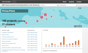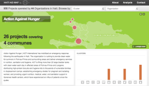 HaitiAidMap.org allows NGOs to link their databases (which can be as simple as Excel spreadsheets) to the site. It renders all of their data about in-country projects on a single, easily readable, interactive map. The projects are searchable by name, location, or “cluster,” through check boxes, drop-down menus, and the interactive map itself. (There’s no search field, however.)