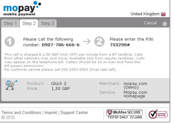After authorization, mopay places the charge to the land line phone account and the purchase is completed. The charge later appears on the consumer’s phone bill along with voice charges. mopay call does not require any registration and is available to all consumers who have access to a land line phone.