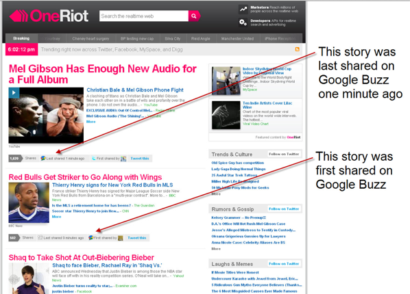 Realtime search results will now be incorporating what is being shared most by Buzz users. This also means that the 150 partners that use OneRiot’s search API will also now see content shared by Buzz users. And OneRiot will be incorporating Google Buzz into its Trending Topics Engine, which finds hot topics by analyzing the realtime conversations across Twitter, Facebook, MySpace, and Digg.