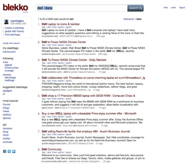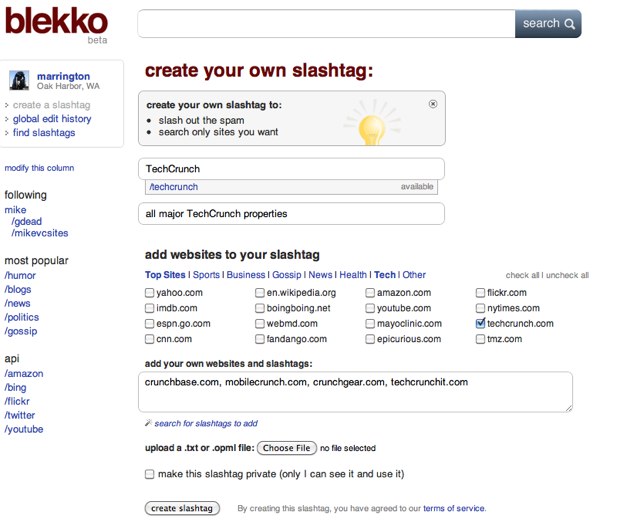 Users can create their own slashtags based on a group of URLs. I’ve created one that lists all TechCrunch sites to do easy site search. Others have created slashtags for conservative or liberal blogs, top tech sites, etc. If they make those slashtags public, others can use them, too.
