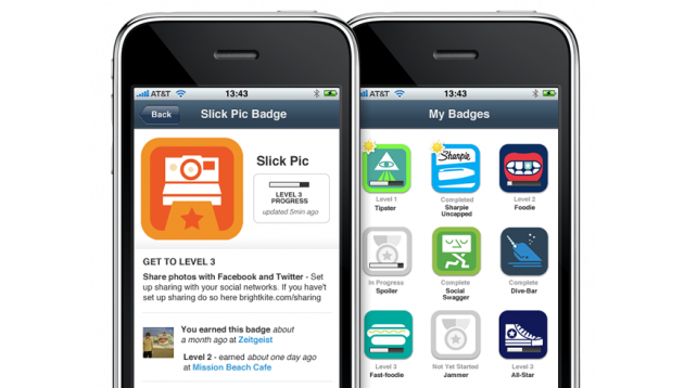 Brightkite badges now have levels. For example, if you use their mobile website or one of their many mobile apps to post 10 photos, you’ll earn a ‘Slick pic’ badge at level 1. You can monitor your progress in a status bar on the badge, which will be visible on the web or your iPhone. Once you get to level 1, Brightkite will tell you what to do to get to level 2, and so on.