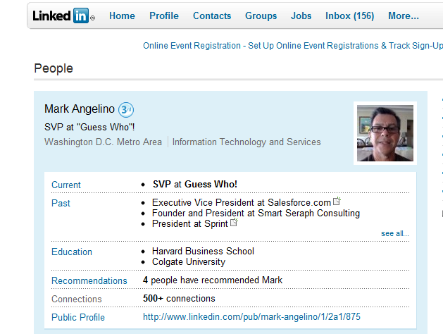 As you can tell from the screenshot above, he left Salesforce.com in June to become Senior Vice President at another company, but he played coy and marked his new employer’s name ‘Guess Who!’.