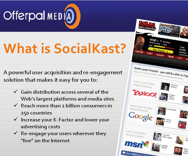SocialKast allows game developers and social platforms to ‘write once’ in order to interact with multiple platforms using a set of lightweight REST messaging APIs and Javascript calls, allowing them to distribute both user-to-user and app-to-user invites, gifts, notifications and other types of text-based or graphical messages directly into the activity streams and email inboxes of Offerpal’s partner sites.