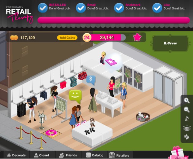 That’s a far cry from the tens of millions of users who diligently fertilize crops on Farmville’s acres, but PopSugar’s Retail Therapy has potential. The game has the power and eyeballs of Sugar’s network at its disposal (the consortium averages 16 million uniques per month) and Retail Therapy has already forged partnerships with several high-profile fashion labels, including Diane Von Furstenberg, Gap, Barneys New York, Juicy Couture, Tory Burch and TopShop.