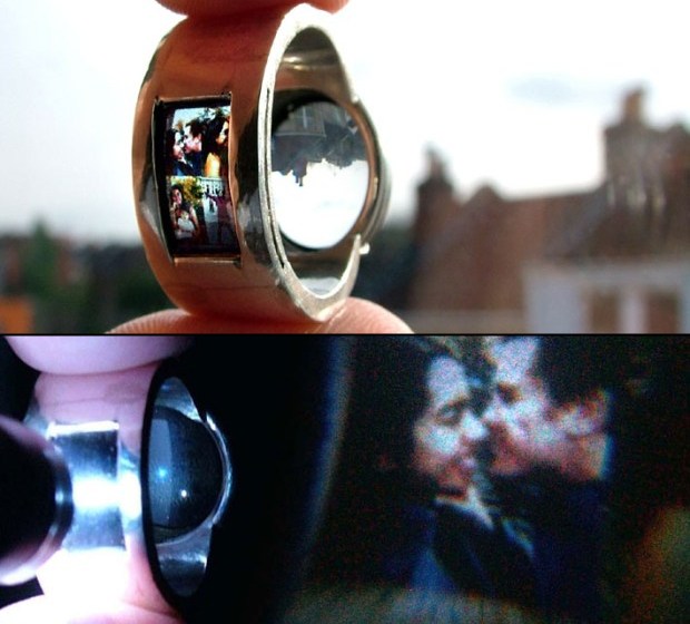This is just too cute to pass up. Thoughtful and crafty newly-wed husband Luke Jerram worked with a jeweler to create this projecting ring. A lens is embedded in one side, as you can see, and some tiny slides in the other. Get a decent light source behind it and boom — instant memories.