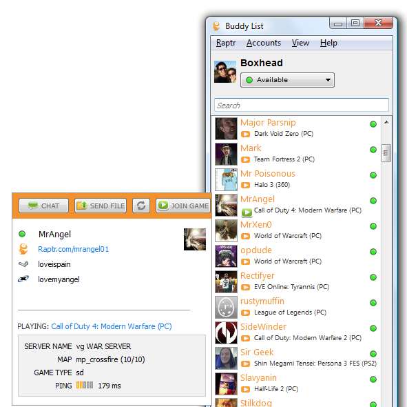 When you see that one of your buddies is online and in a game, you can send messages to them from the Raptr client regardless of which platform they’re on. For some games, you can see even more supplementary information — for example, if someone is playing Madden 2010, you can see which teams your friends are playing as. Another recently added feature is a chat overlay, which PC gamers can pull up on top of the game they’re playing without having to switch — or “alt-tab” — out of their gaming session.