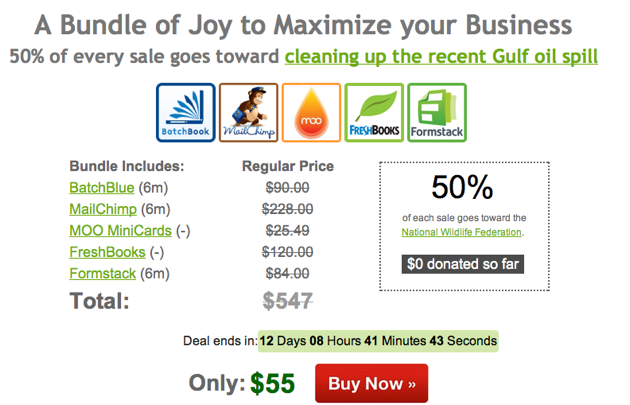 Today AppSumo is running a deal that it’s calling the “Entrepreneur Bundle”: for $50, it includes premium access to social CRM BatchBlue, email marketing manager MailChimp, business card maker MOO, finance tool FreshBooks, and Formstack, which offers wizards for building out web-based data forms. To sweeten the deal, the company will be giving 50% of every sale to the National Wildlife Federation to help with the oil spill crisis.