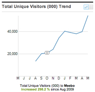 We last did a deep dive on the progress of the Meebo Bar in December, when Quantcast figures showed it reaching nearly 100 million unique visitors across Meebo partner sites. That number on Quantcast is now up to nearly 150 million, and since August, comScore says that Meebo’s uniques are up nearly 300%. In terms of functionality the Meebo Bar hasn’t changed much since I last spoke to Sternberg, but the amount of money it pulls in certainly has: Sternberg says that the Bar is doing 4x revenue growth year over year, and that revenue is 4x right now what it was in January. In other words, things are picking up quickly (though it’s worth pointing out that Meebo declined to share any concrete revenue figures).