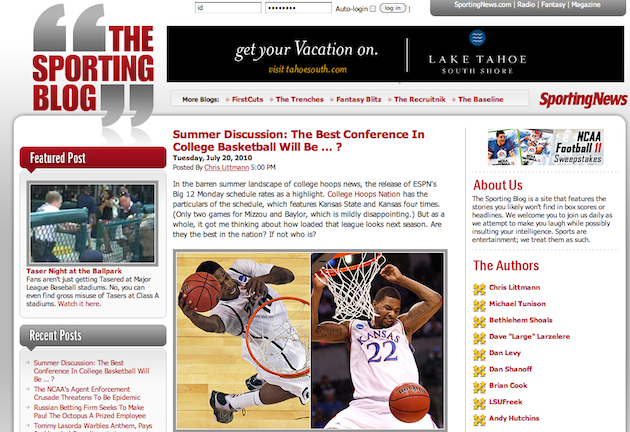 First, SB Nation has acquired a property: SportingNews’ The Sporting Blog. Launched in 2007, The Sporting Blog is meant to be a slightly more fun take on sports news. But as SportingNews, an outfit that is well over 100 years olds, is moving towards a more comprehensive coverage approach, they believed SB Nation would be a great new home for their blog.