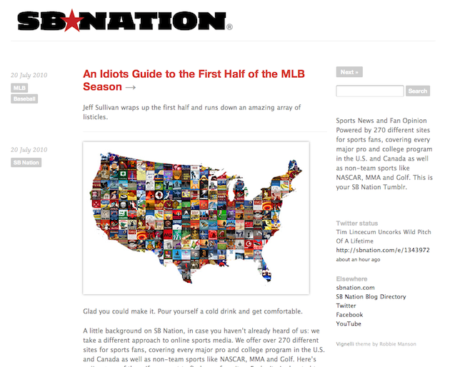 The second maneuver SB Nation is making today is the launch of a new Tumblr blog. While the point of this may not be immediately apparent since SB Nation is already a network over over 270 blogs, SB Nation is following in the footsteps of companies like Newsweek, who have been able to leverage the unique blogging platform to extend their content.
