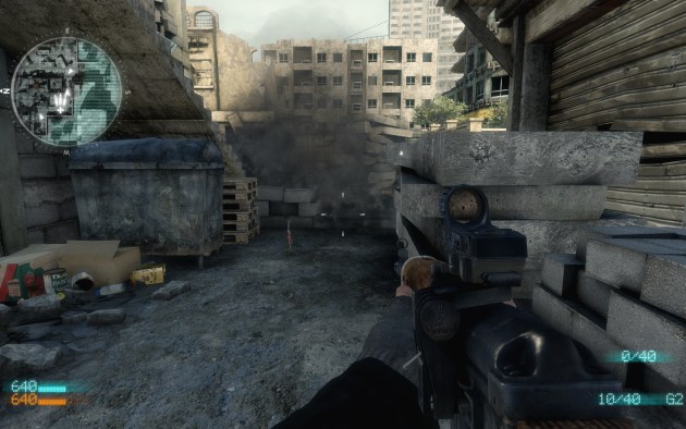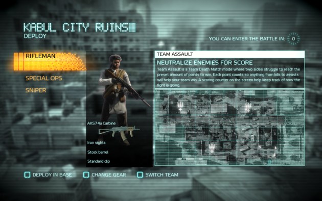 Each side has the same three classes: Rifleman, Special Ops, and Sniper (I play as sniper because I’m sneaky like that), and there’s a few different modes. There’s a standard team deathmatch and a mode where Team A has to attack a base and Team B has to defend a base. So, you shoot your fellow man over and over again until your side wins (hopefully). Along the way you earn points that you can later use to upgrade your equipment, like an extra magazine clip. Presumably the final game game will have more “prizes.” You also earn medals for your in-game heroics.