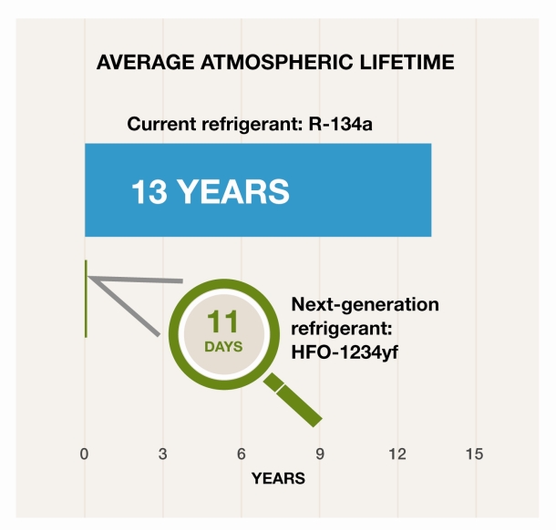 The new refrigerant is made by Honeywell, and remains in the atmosphere for a mere 11 days, instead of the 13 years that R-134a does. The new coolant will be used in GM’s Chevrolet, Buick, GMC, and Cadillac cars starting in 2013. I’d expect that the new refrigerant will end up being required by the EPA, assuming that it performs as expected.