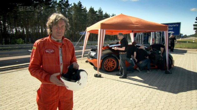 A few days ago we learned that the Bugatti Veyron Super Sport is now the fastest production car on the planet. Pretty exciting, yes. A little bit after that we learned that Top Gear, the very awesome British TV show I watch despite my having zero car knowledge, was involved in the record-breaking in some capacity. Basically, Captain Slow himself, James May, actually broke the record first—but then his record was smashed, too.