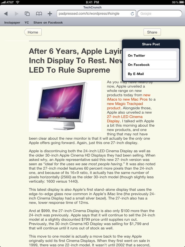 So If you’re a web publisher that wants to optimize your content specifically for the iPad as inexpensively and quickly as possible PadPressed is available now for a $49.95 one time fee which includes any updates to the theme. To try out on an iPad before you buy, you can check out Baptiste’s PadPressed personal blog here.