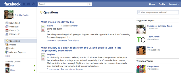 The motivations behind the launch are clear: millions of people already use Facebook status updates to poll their friends — it’s only natural that the site would offer a dedicated mechanism to do this (and it’s also likely to be a boon for page views, especially once Questions are syndicated to search engines). But if you were hoping the new product would incorporate Facebook’s extensive privacy settings, you’ll be disappointed: everything in Questions is shared with everyone else on Facebook, and every question you ask is tied to your real name; likewise, anyone who answers will have their response tied to their account.