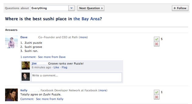 This could be a big, big deal for the site. Given its size, it won’t take long for Facebook to build up a massive amount of data — if that data is consistently reliable, Questions could turn into a viable alternative to Google for many queries. Facebook will also be integrating Questions and their answers into the Community Pages that launched in April, which already include content from Wikipedia and Facebook user status updates. Finally, this is a big SEO opportunity for the site, though a Facebook spokeswoman said that there are no plans to include the content in search engines yet.