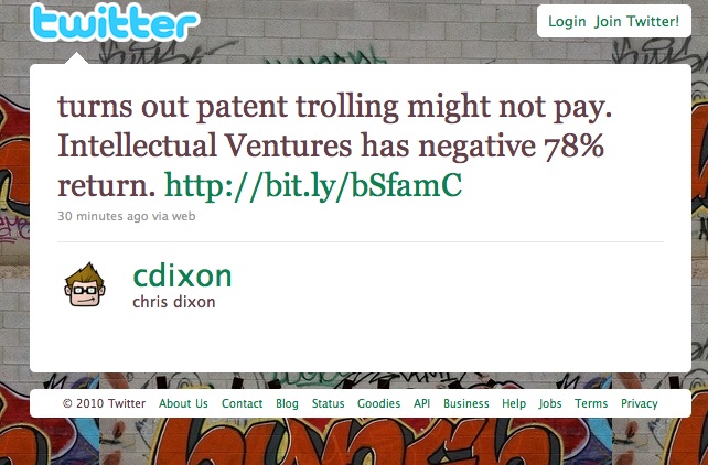 turns out patent trolling might not pay. Intellectual Ventures has negative 78% return.http://bit.ly/bSfamC