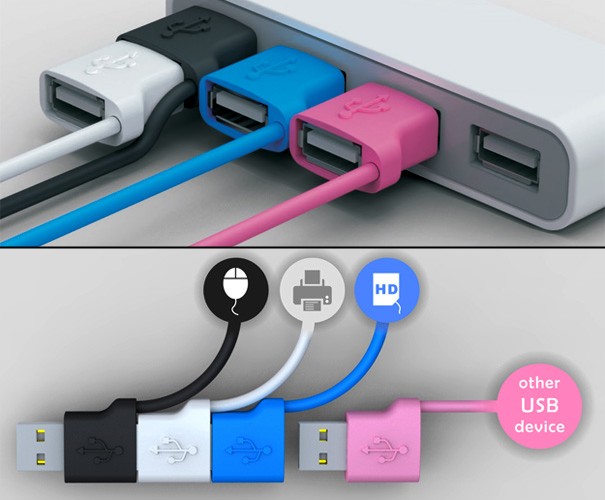 While I applaud the elegant nature of this USB centipede concept, it brings up (as most concepts do) as many questions as it answers. How will power be isolated in one or another device? How much will an integrated USB controller increase the price of each device? What if you need to unplug the one in the middle?