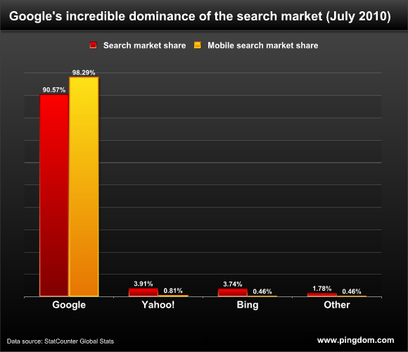 Google currently boasts a mobile search market share of 98.29%, with it closest competitor Yahoo taking up just over 0.8% of market share and Microsoft’s Bing barely touching even half that, according to recent data from StatCounter as relayed by Pingdom.