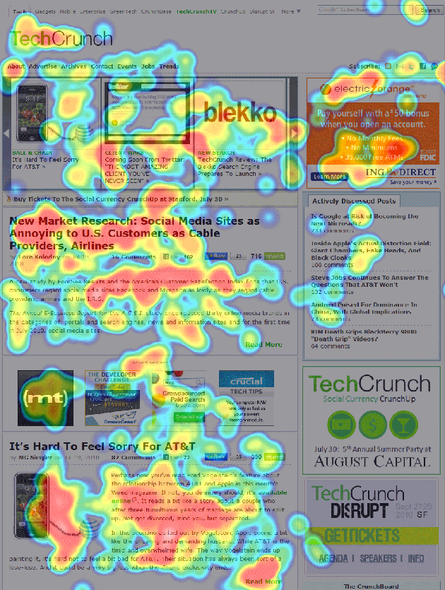 Weary readers have learned to ignore ads, especially those placed in the bottom right corner. Say Krausz, “People are so good about identifying ads nowadays that if anything looks like one you lose the entire area.” Below is a GazeHawk heatmap of our homepage — most notably people are looking at our story rotator, ING ads and not our events stuff. So quick look to the bottom right! Look!