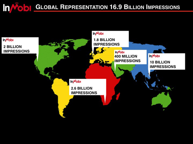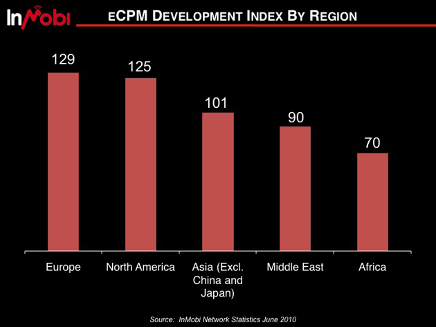 Out of inMobi’s 16.9 billion mobile ad impressions globally, 2.6 billion are in Africa, more than the US’s 2 billion. 10 billion are in Asia, no surprise considering inMobi was founded in India and had more time to develop reach, while Europe follows Africa with 1.6 billion and the Middle East .5 billion. InMobi’s mobile eCPM development is highest in Europe at 29%, with North American coming in a close second at 24%.