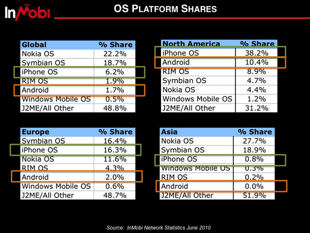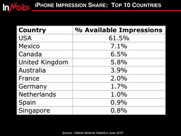 Lamberti says that InMobi’s biggest growth markets are in the US, Japan, and South America and the US, partially because of the benefits from Google Ad Mob changes on the iPhone. While 60% of all mobile iPhone impressions are still in the US, inMobi is now poised to to monetize the 40% that aren’t.