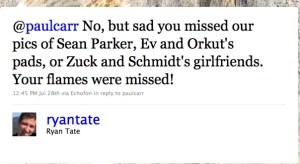 And it’s for that second reason – his inability to stand by his grubby work – that Ryan Tate, if he has an ounce of pride left in his body, needs to resign. And if he won’t do that – which he won’t, because he hasn’t, and because he knows that the position of village idiot has already been filled – then it’s for that reason that Denton needs to fire him and either go back to running Valleywag himself, or close it down once and for all.