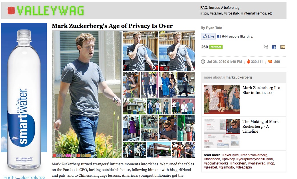 Of course, much of the above is bullshit speculation, but the result is the same: on Wednesday, under a “Gawker Exclusive” banner, and the headline, “Mark Zuckerberg’s Age of Privacy Is Over” Tate published twenty candid photos, clearly identifying Zuckerberg’s home, his girlfriend, his friends and his regular haunts. In “justification”, Tate wrote…