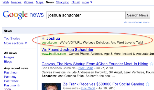 As a sidenote, this is the second time Schachter has found oddly targeted ads around his name. The last time, it was Yahoo (the company he quit in 2008 after selling Delicious to them) who was trying to find new employees on Google off of searches for his name. Classy.