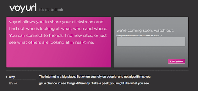 A few weeks ago, we were alerted to a new site currently in stealth mode called Voyurl. As the name implies, the idea behind it is to make it so you can see what other people are looking at on the web (and to make your clickstream seen). It sounds creepy as hell. It’s like Blippy but with more potential porn. I love it.
