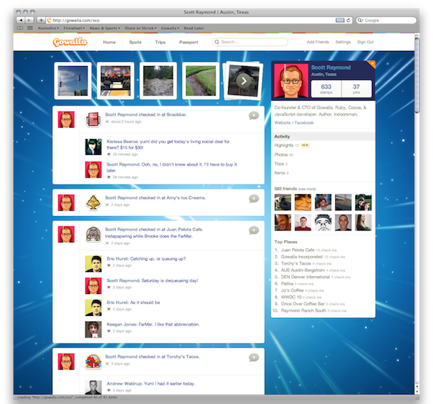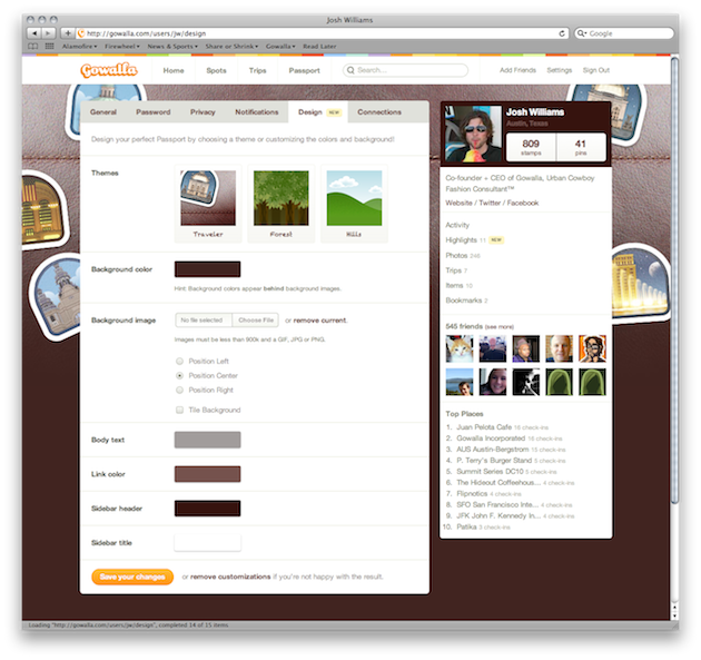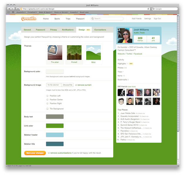 Your Gowalla Passport is essentially your profile page, but Gowalla organizes it in a way to highlight some of the core features that help them differentiate themselves — namely: pictures, comments, stamps, and pins. Beginning on Wednesday, you’ll be able to completely customize the design of this area. Gowalla will provide you with a few themes designed by their team (a heavily design-focused team), or you can build your own. Previously, these custom passports were only available as a premium feature viven to select partners such as LIVESTRONG, CNNMoney, and USA TODAY.