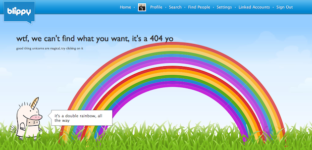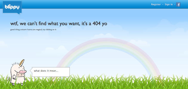 As you can see here, Blippy’s 404 page features a glorious rainbow. And while it’s not exactly a double rainbow, the cute unicorn child creature seems to think it may be. “What does it mean…,” he wonders.