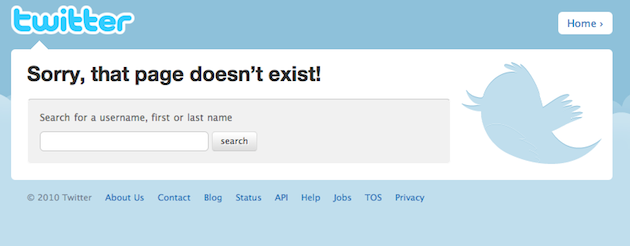 As a sidenote, some people may think Twitter has the most famous 404 page these days with the Fail Whale. But that’s not actually a 404 error. Technically, the Fail Whale is a 503: Service Unavailable, error. The Twitter 404 page is much less exciting (below).
