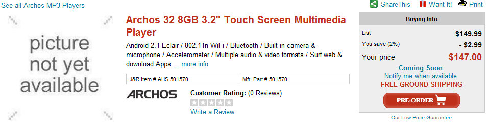 JR.com posted the Gen 8 Tablet’s product page a bit early it seems, revealing these specs. A 3.2-inch 400 x 240 display is up front with a ARM Cortex A8 powering Android 2.1. The big story is that JR listed this guy with 32GB storage for only $150. That’s literally half the price of the comparable iPod touch. Of course fanboys will quickly point out the device isn’t exactly comparable because the Archos Android device simply doesn’t have the same apps available, but I believe 32GB for $150 more than makes up it. Yeah, it’s only an 8GB module. Nothing all that special.