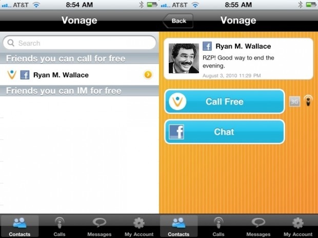 The app, called Vonage Mobile for Facebook, is an odd, viral solution for voice communications. The app trolls your Facebook profile for compatible friends and shows you that they are able to either take voice calls or chat. Regular updates remind you to tell your buds about the service via Facebook, thereby completing the human centipede of Vonage connected-ness.