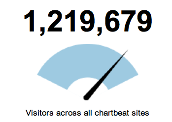 Chartbeat tracks concurrent visitors, and this week it passed one million concurrent visitors across the 4,000 sites which use its analytics. These sites include TechCrunch, The New York Times, Groupon, and The Onion. This number is not one million visitors a month, or a million a day. It is one million visitors right now, and it has consistently been above the one-million mark most of this week. There is a dial on Chartbeat’s homepage which shows the total number of realtime visitors.