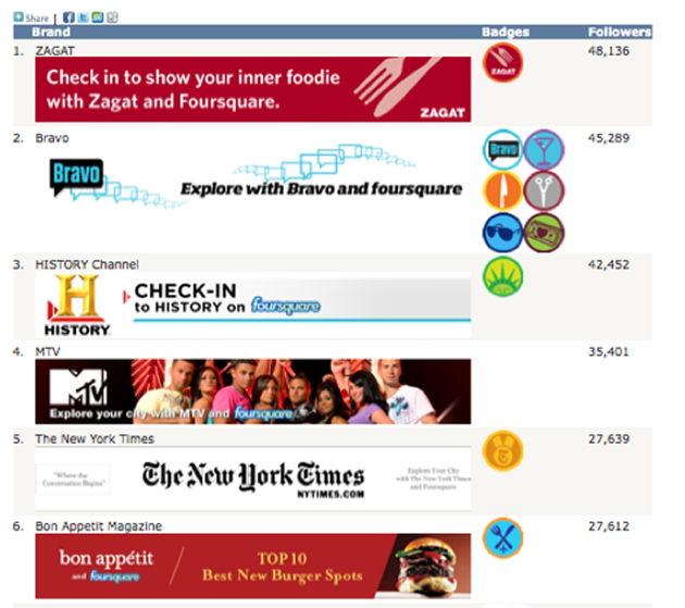 At least according to the folks at custom badge site Osnapz, who have created a Foursquare brand leaderboard stack ranking the location based service’s many promiscuous partnerships in terms of follower count, with Zagat in the top slot at 48,136.