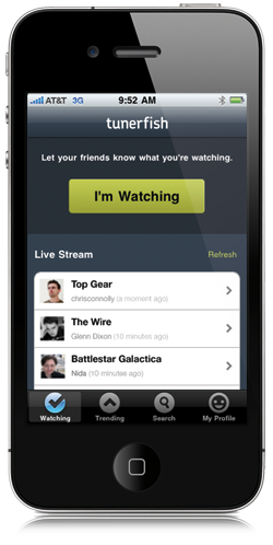 The gist of the application is simple: instead of aimless channel surfing, which often yields lackluster results, Tunerfish lets you see what your friends are watching (think Foursquare for video). Launch the Tunerfish app, and you’ll see a list of the shows your Tunerfish friends have checked into (you can choose to check into content that spans television, movies, and online video) as well as trending shows. Once you’ve found something you like, you can check-in to notify the rest of your Tunerfish-using friends what you’ve come across. Updates can be syndicated to Facebook as well.