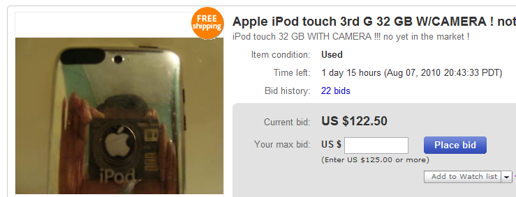 While the whole world waits for the official iPod touch camera edition, one random dude is selling a camera-equipped 3rd generation model right now on ebay. It’s not going to be cheap (current bid is over $120 as of writing) but the winner will have a bonafide piece of Apple history.
