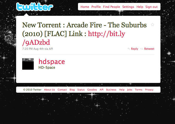 Despite this risk, torrenting activity on Twitter shows no signs of ceasing. Twitter search “Mad + Men + torrent+ S4 + Ep3” shortly after 7pm PDT on Sunday and be amazed at how quickly people post torrent files. Or just search for “Arcade+Fire+the+ Suburbs + torrent” right now. The launch of a Twitter-specific torrent indexing system only further reinforces the fact that Twitter has now become a powerful locus for file-sharing.