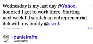 Well known engineer and product guy Daniel Raffel returned to Yahoo a year ago to help work on whatever it is that Yahoo intends to be. Fast forward to today and he’s out of there, teaming with Googler Steve Krulewitz on a new startup. The two worked together at Pioneers of the Inevitable on the Songbird media player.