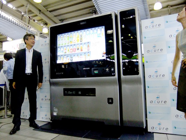 Last year, we’ve shown you Yahoo Japan’s digital signage system that scans passersbys to put up personalized content (ads, news, and other information). And today, railway operator JR EAST showed a very similar device that’s actually a mix between digital signage system and vending machine.