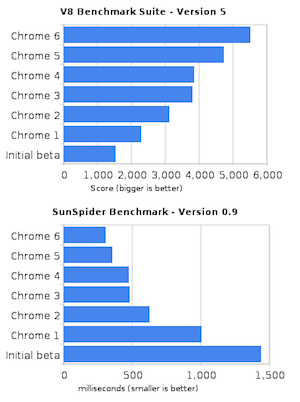 In terms of performance, Google says Chrome 6 is 15% faster than Chrome 5 beta in both the V8 benchmark test and the SunSpider benchmark test (two JavaScript tests).