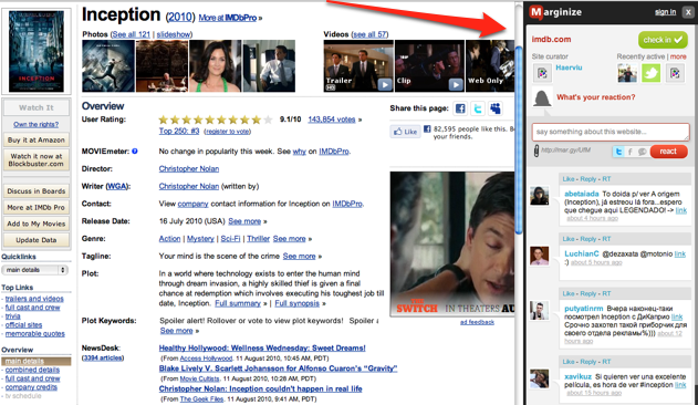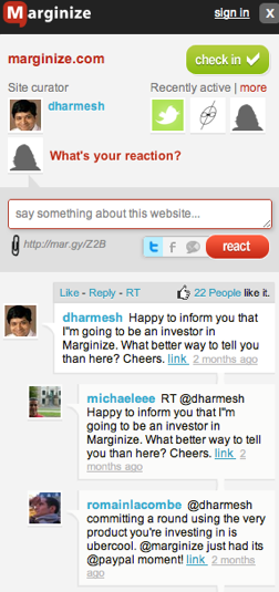 The service is pretty simple: visit a website, and you’ll see a persistent frame on the right hand side of the screen displaying comments and tweets from other users (there are also options to share which page your browsing and what you’ve written). There’s also a Foursquare-like check-in component, which lets you show your friends how often you’ve visited a certain website. If you’d like to see it for yourself, here’s the Marginized link for this page.