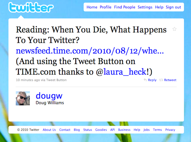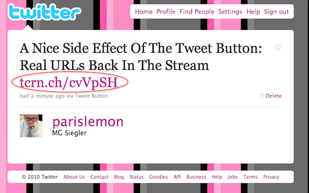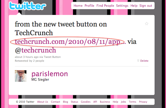 Of course, we just implemented our own shortener, tcrn.ch, to work with the new Tweet Button — so now you’ll see that rather than beta.techcrunch.com. But that’s okay because you’ll still know it’s a TechCrunch link (as you have been able to for a while thanks to Bit.ly). But this is really key for sites that don’t have their own custom shorteners — you’ll no longer have to wonder exactly where you’re about to go when you click on a link (assuming that link was sent via the Tweet Button).