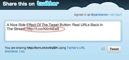 The new Tweet Button, which was officially unveiled by Twitter earlier today (and is already up and running on TechCrunch), by default wraps all links in Twitter’s own t.co URL shortener. But this shortening is only for the pop-up tweet box and so Twitter can make sure the URL isn’t a malicious one. When it is sent out to your tweet stream, you’ll now see the actual URL (though abbreviated).