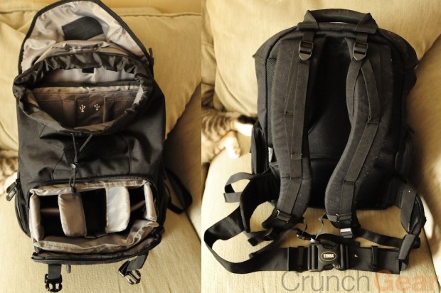 Tenba’s Photo/Laptop Daypack combines a basic padded laptop sleeve with an advanced camera bag. Your laptop (up to 17-inch) slides in to the pocket at the back of the bag, while your camera fits into a special pocket at the bottom of the bag. The camera pocket unzips separately from the rest of the bag, and then folds out, giving you access to your DSLR, 2-3 lenses, and possibly a flash. There are organizer pockets on either side of the pack, with red and green pockets for your memory cards. The top of the bag has a drawstring closure underneath a buckle/velcro secured flap. This top pocket is intended to store accessories like your mp3 player, cell phone, keys, etc.
