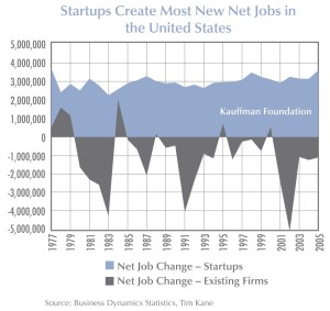 Kauffman Foundation has done extensive research on job creation. Kauffman Senior Fellow Tim Kane analyzed a new data set from the U.S. government, called Business Dynamics Statistics, which provides details about the age and employment of businesses started in the U.S. since 1977. What this showed was that startups aren’t just an important contributor to job growth: they’re the only thing. Without startups, there would be no net job growth in the U.S. economy. From 1977 to 2005, existing companies were net job destroyers, losing 1 million net jobs per year. In contrast, new businesses in their first year added an average of 3 million jobs annually.